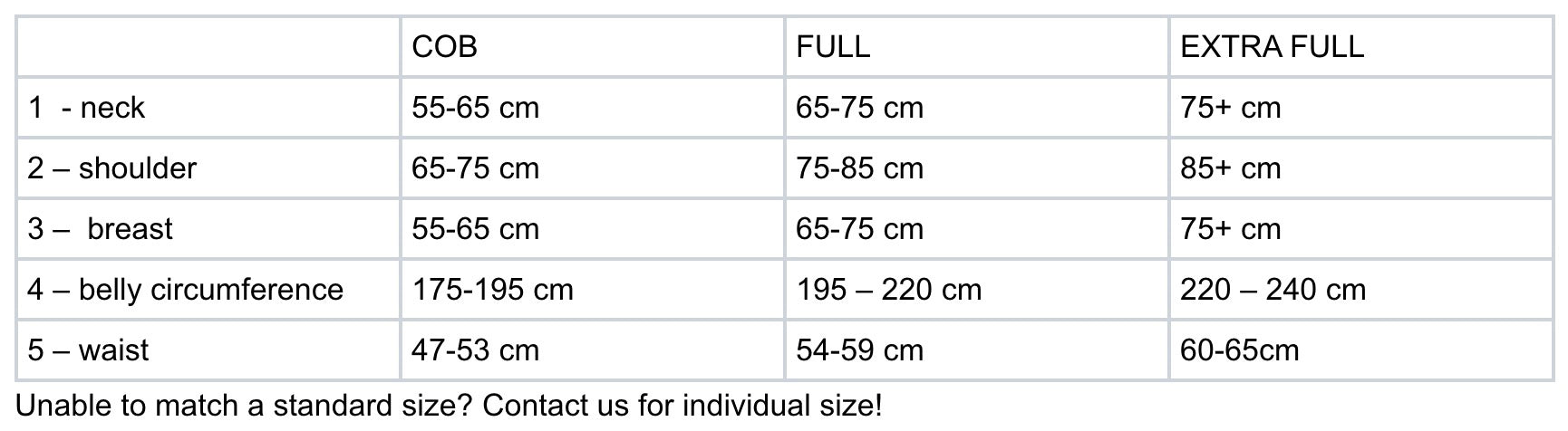 Depending on the measuring results select either FULL, COB or EXTRA FULL.